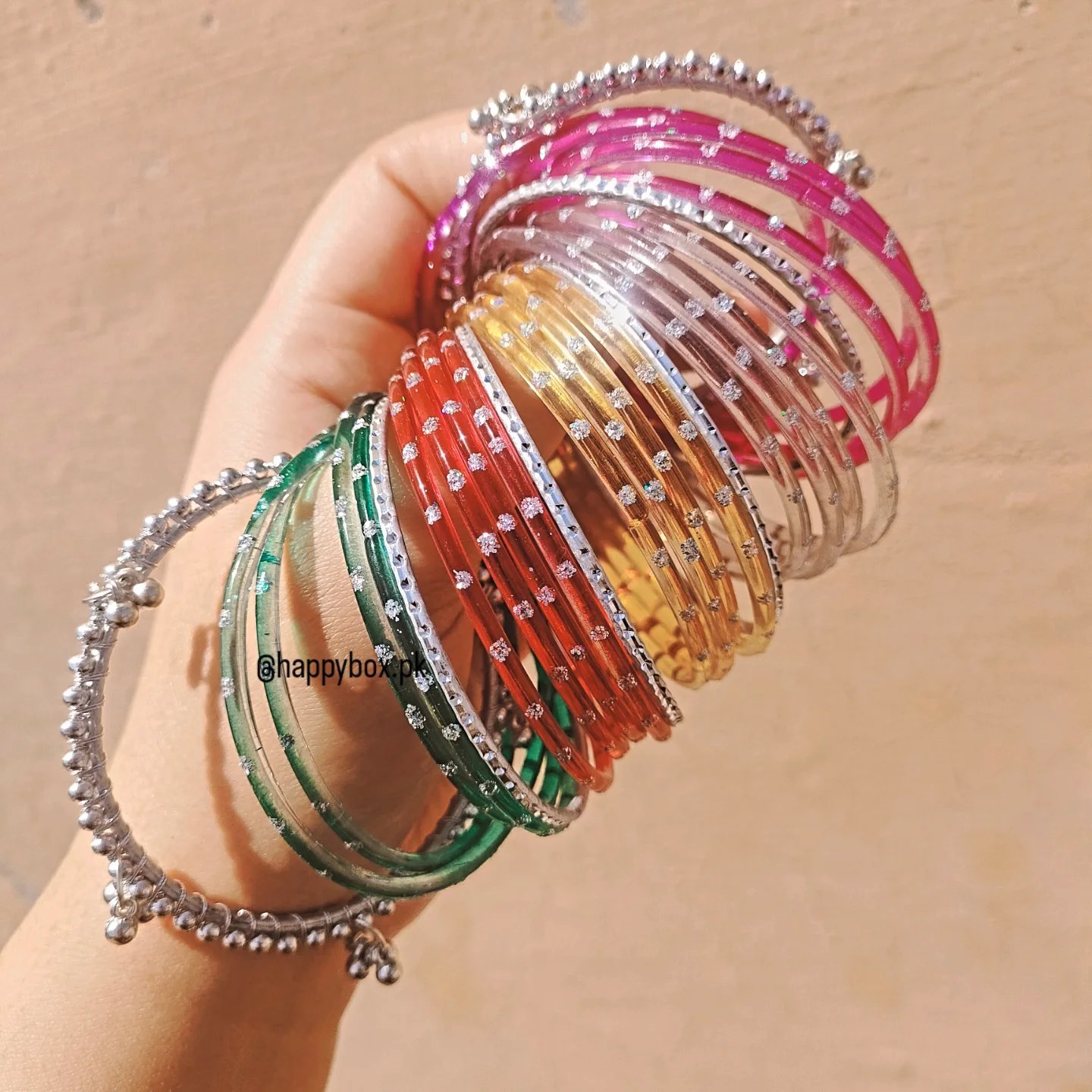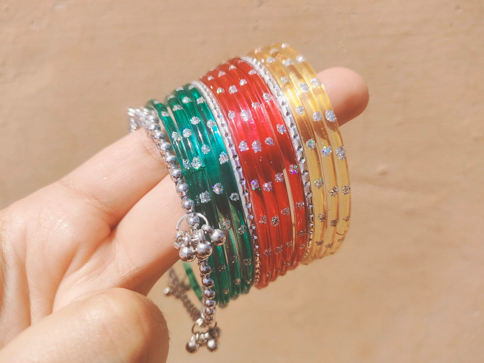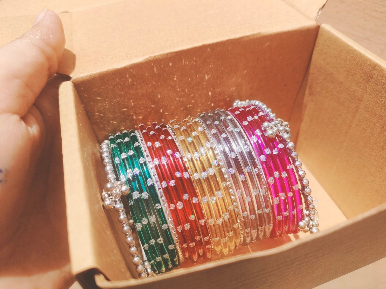 it includes 20 glass bangles, 4 metal silver bangles, and 2 kashmiri kangans.